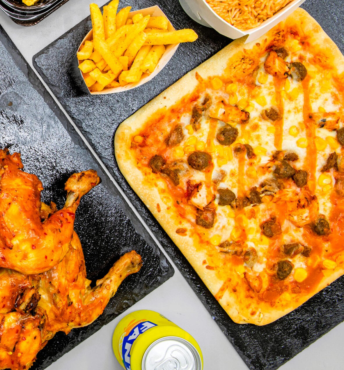 10" | 12" | 14" | 16"Vegetarian (v)Margherita (v) – £5.99 | £9.99 | £11.99 | £14.99Vegetarian Supreme (v) – £6.49 | £11.49 | £14.49 | £19.49Vegetarian Hot Supreme (v) – £6.49 | £11.49 | £14.49 | £19.49Indian Veggie Supreme (v) – £6.49 | £11.49 | £14.49 | £19.49Meat & ChickenBeef Pepperoni – £6.99 | £11.99 | £14.99 | £19.99Meat Feast – £6.99 | £11.99 | £14.99 | £19.99Texas BBQ Meat Feast – £6.99 | £11.99 | £14.99 | £19.99Chicken Tikka – £6.99 | £11.99 | £14.99 | £19.99Tandoori Chicken – £6.99 | £11.99 | £14.99 | £19.99Hawaiian – £6.99 | £11.99 | £14.99 | £19.99Peri Peri Chicken – £6.99 | £11.99 | £14.99 | £19.99Peri Peri Chicken Hot – £6.49 | £11.99 | £14.99 | £19.99Tuna Delight – £6.99 | £11.99 | £14.99 | £19.99Chilli Flame Signature – £6.99 | £11.99 | £14.99 | £19.99Chicken Delight – £6.99 | £11.99 | £14.99 | £19.99Make Your Own Pizza£6.99 | £11.99 | £14.99 | £19.99Add UP to 4 toppingsExtra Toppings – £1 eachMeat Topping Options: